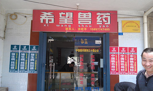 不知不覺一路貼到陳河鎮上,大家加快了進度,沒多久,古鎮主街道兩側的電線桿上就貼滿了回盛的品牌宣傳畫。我們驚喜的發現,鎮上一家希望獸藥店,在店門口醒目的位置還打出了“回盛股份新華星動保連鎖獸藥應城銷量第一”的標語。老板談起銷售業績一臉歡喜,看得出來回盛旗下的產品在鎮上比較暢銷,市場占有率很高。