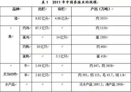 中國是世界上最大的食品動物養殖國,養殖規模大,養殖密度高,環境污染嚴重。據國家統計局,2011年中國肉類總產量7958萬噸、奶3810萬噸、禽蛋2811萬噸、毛類45.5萬噸、淡水產品2695.2萬噸,具體如表1所示。