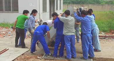 午飯后,大家顧不上休息。來自各個(gè)部門的十五六名青壯年,聚集在設(shè)備安裝現(xiàn)場(chǎng)。在郝康廠長(zhǎng)的帶領(lǐng)和指揮下,所有人一共分為三個(gè)小組。第一個(gè)小組負(fù)責(zé)在混合機(jī)下面鋪設(shè)鋼管,使二維混合機(jī)能始終在鋼管上滾動(dòng)。第二個(gè)小組在后面,負(fù)責(zé)推、撬動(dòng)混合機(jī)。第三個(gè)小組則在前面依靠纜繩使勁地拉動(dòng)混合機(jī)。在“一、二、三”的吶喊聲中,大家配合的很默契,二維混合機(jī)也朝著預(yù)定的方向蠕動(dòng)著。一兩個(gè)小時(shí)過去了,大家的聲音變得嘶啞了,衣服也都被汗水浸透了。值得欣慰的是,二維混合機(jī)最后以“倒車入庫(kù)”的方式準(zhǔn)確、安全地定位了。